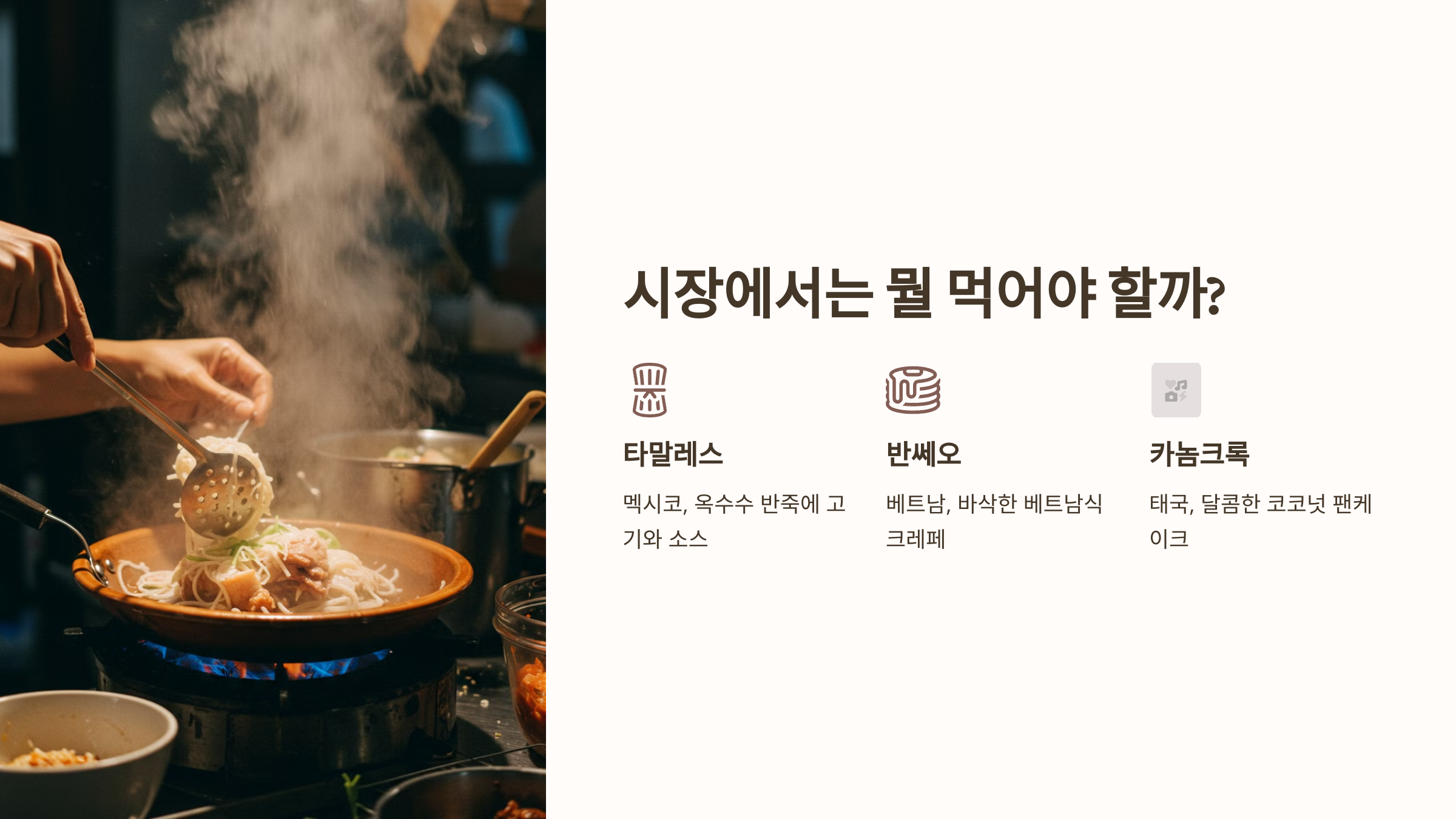시장에 가면 눈도 즐겁고 코도 행복하지만, 가장 중요한 건 바로 먹는 재미죠! 현지인들이 추천하는 시장 필수 음식 리스트를 소개합니다.