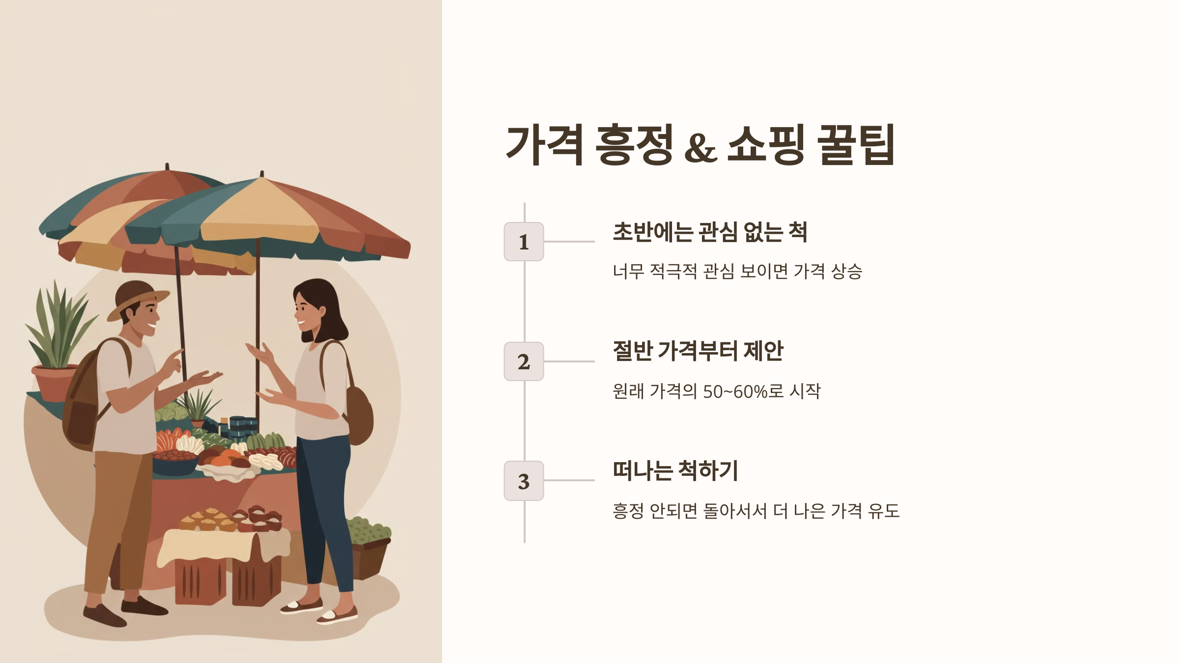 현지 시장에서 쇼핑을 할 때는 가격 흥정이 필수! 하지만 아무렇게나 하면 오히려 손해를 볼 수도 있어요. 현지인처럼 능숙하게 쇼핑하는 몇 가지 팁을 알려드릴게요.
