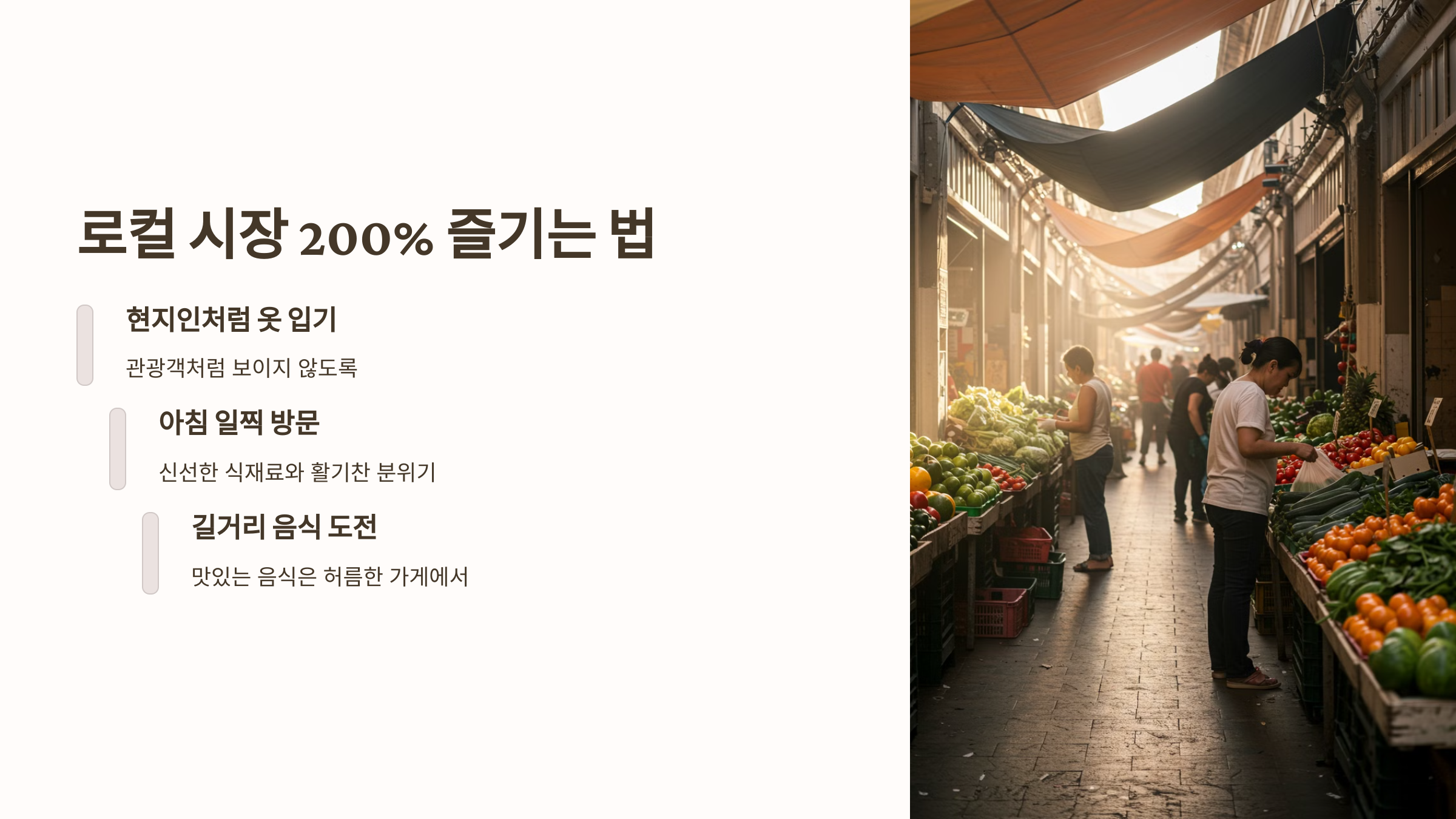 여러분, 이제 관광객이 아닌 진짜 현지인처럼 여행할 준비가 되셨나요? 😊 로컬 시장은 단순히 물건을 사고파는 곳이 아니라,