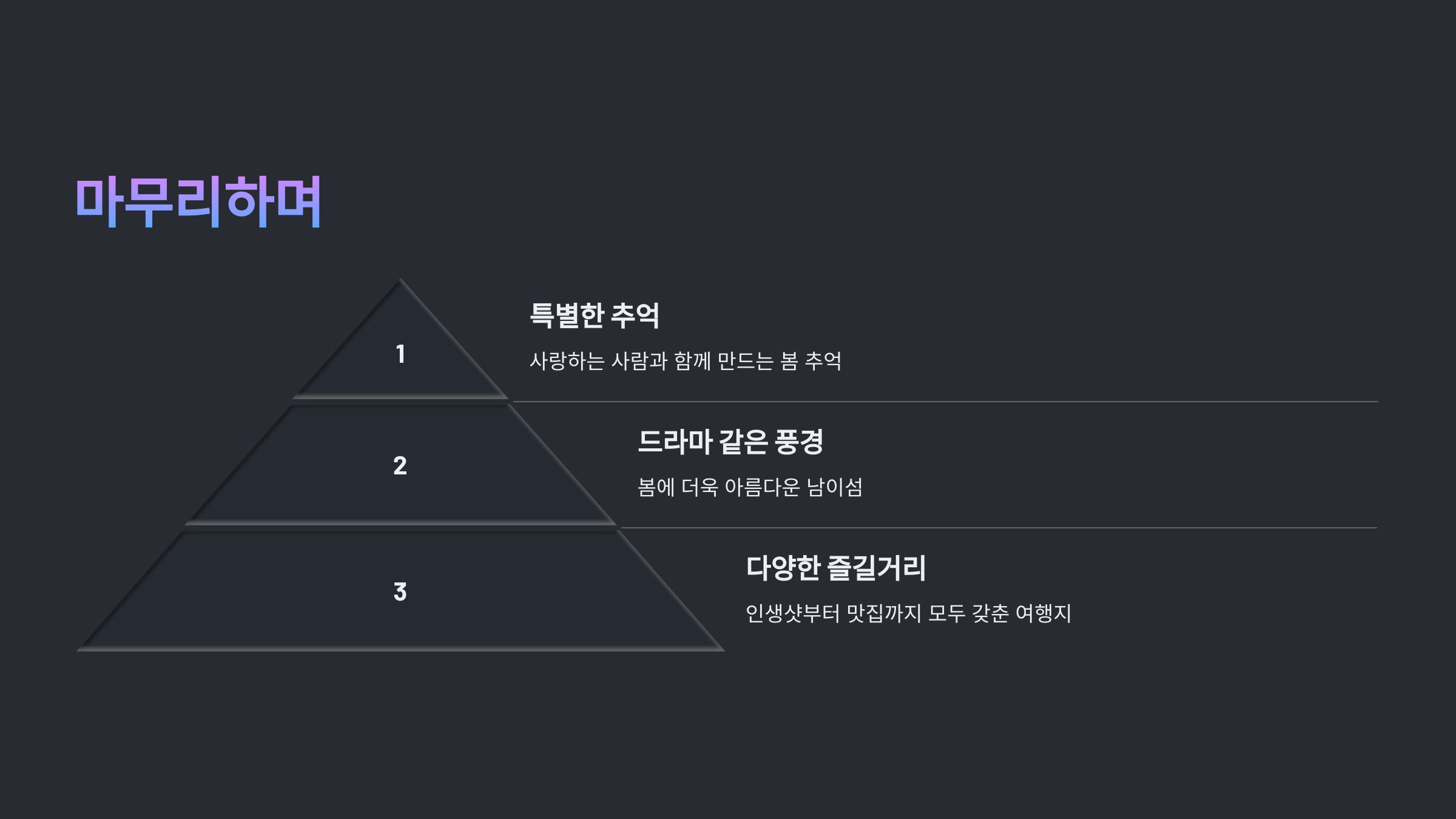 - 벚꽃이 만개하는 주말에는 **벚꽃축제**도 함께 즐기기