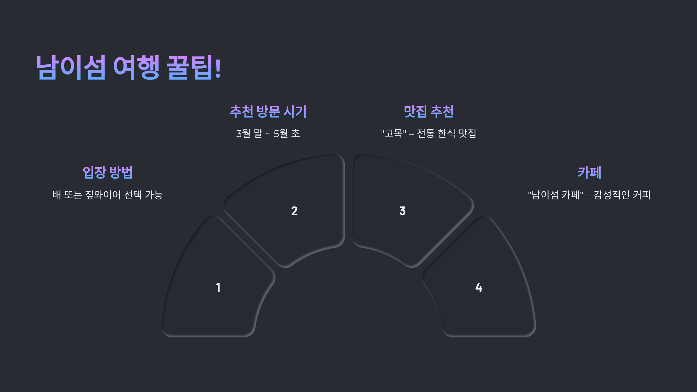 🍽️ **맛집 추천:** "고목" – 전통 한식 맛집, "남이섬 카페" – 감성적인 커피 한 잔