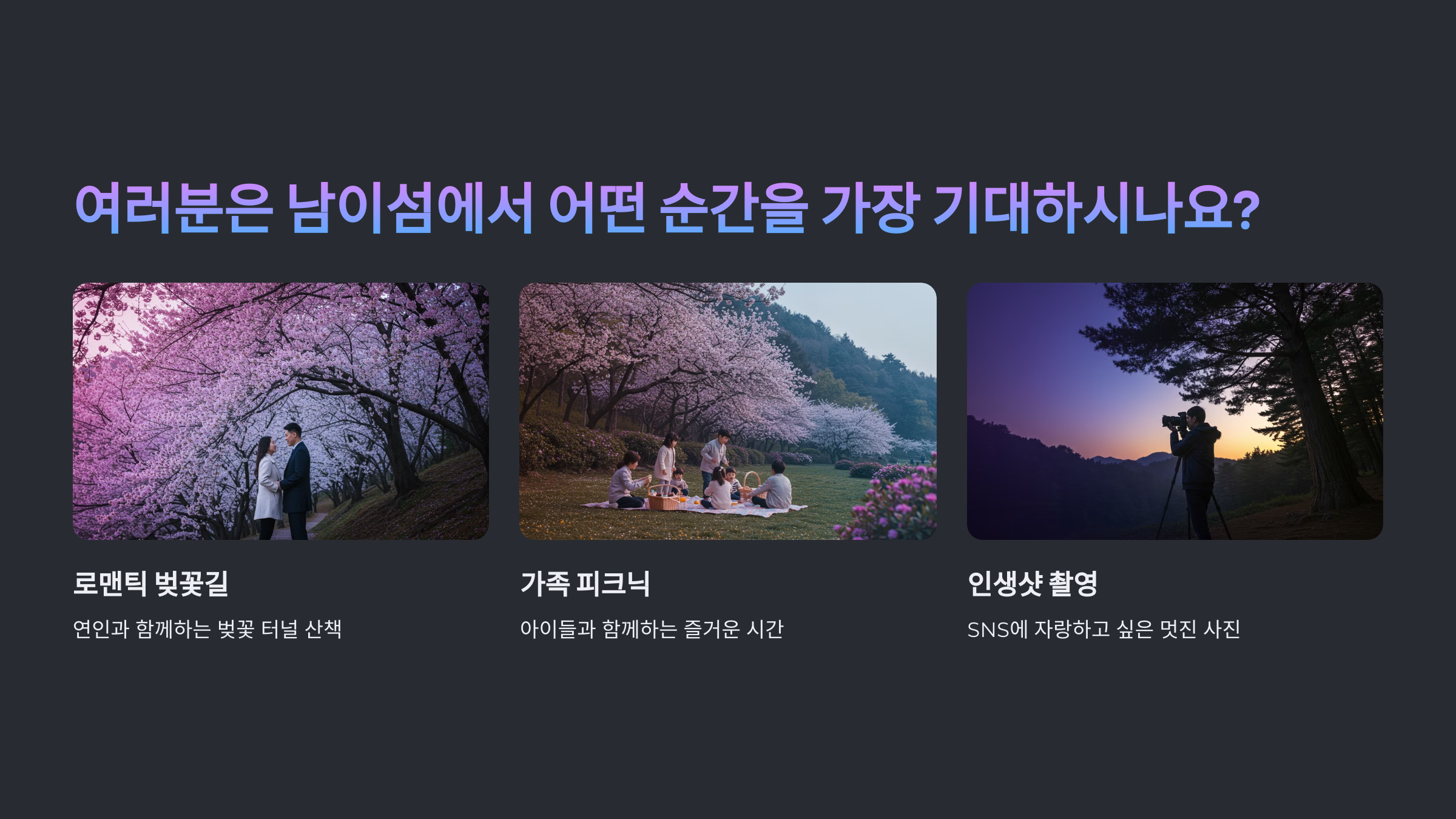 ## 여러분은 남이섬에서 어떤 순간을 가장 기대하시나요? 🌿