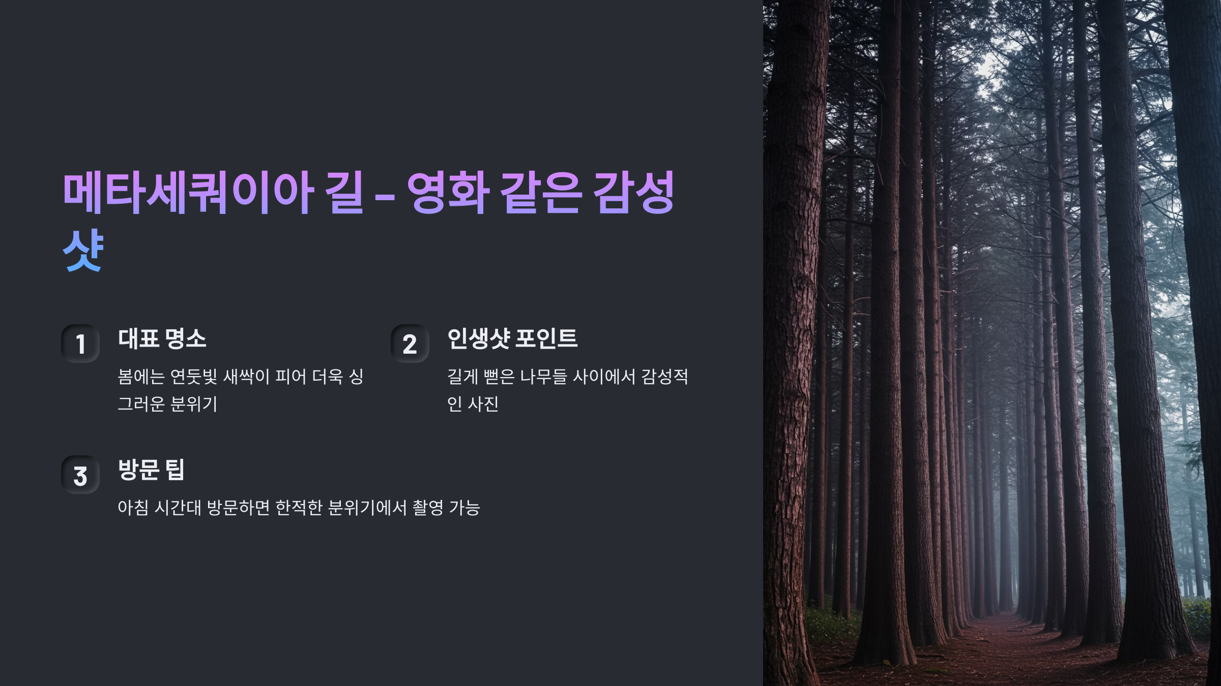 1. **메타세쿼이아 길** – 인생샷 명소 📸