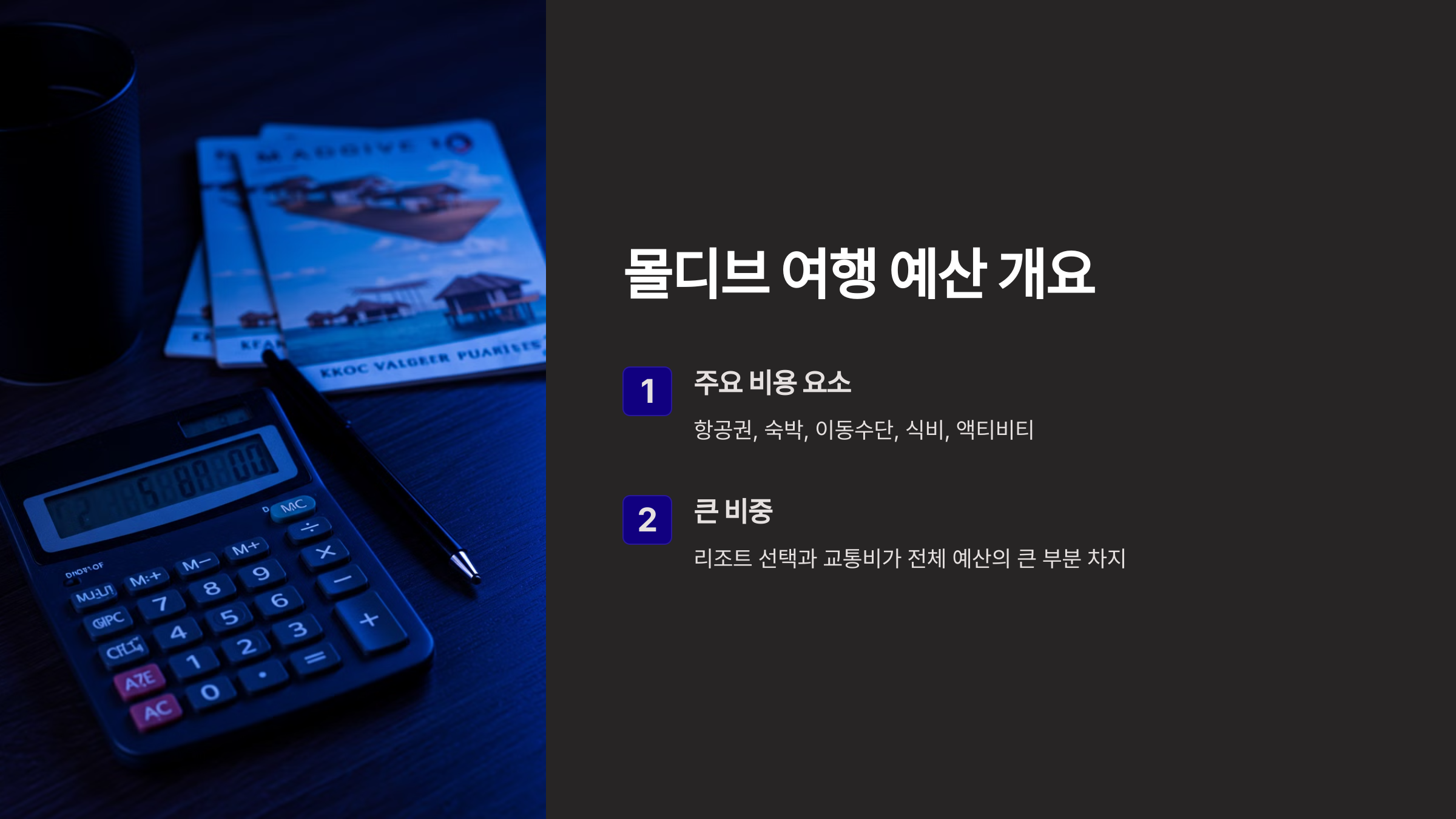 몰디브 여행 비용은 **항공권, 숙박, 이동수단, 식비, 액티비티** 등의 요소에 따라 크게 좌우됩니다. 특히 리조트 선택과 교통비가 전체 예산의 큰 부분을 차지하는데요. 아래에서 각각의 비용을 절약하는 꿀팁을 하나씩 알려드릴게요! 🏝💳