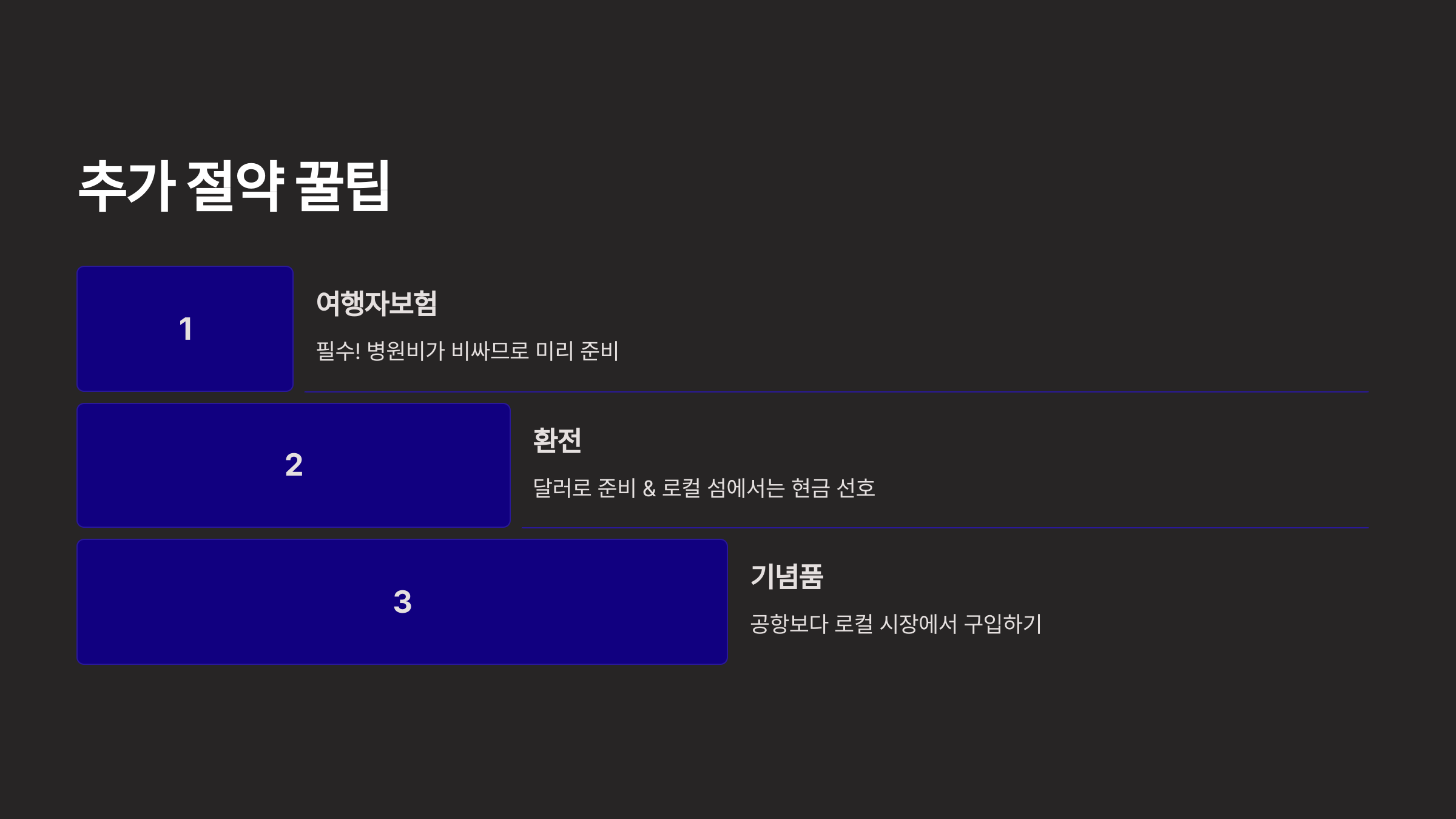 ✅ **환전은 달러로 준비 & 로컬 섬에서는 신용카드보다 현금 선호**