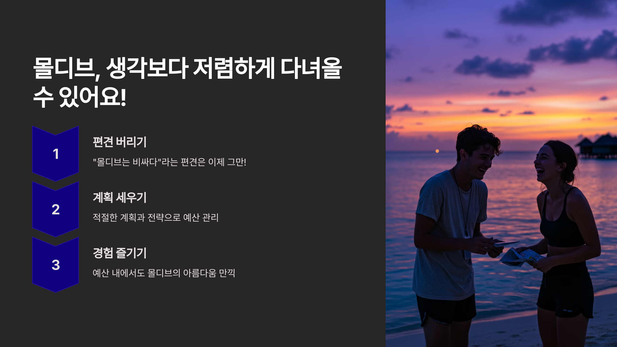 "몰디브는 비싸다!"라는 편견은 이제 그만! 적절한 계획과 전략을 세우면 예산 내에서도 충분히 몰디브를 즐길 수 있어요. 🏝