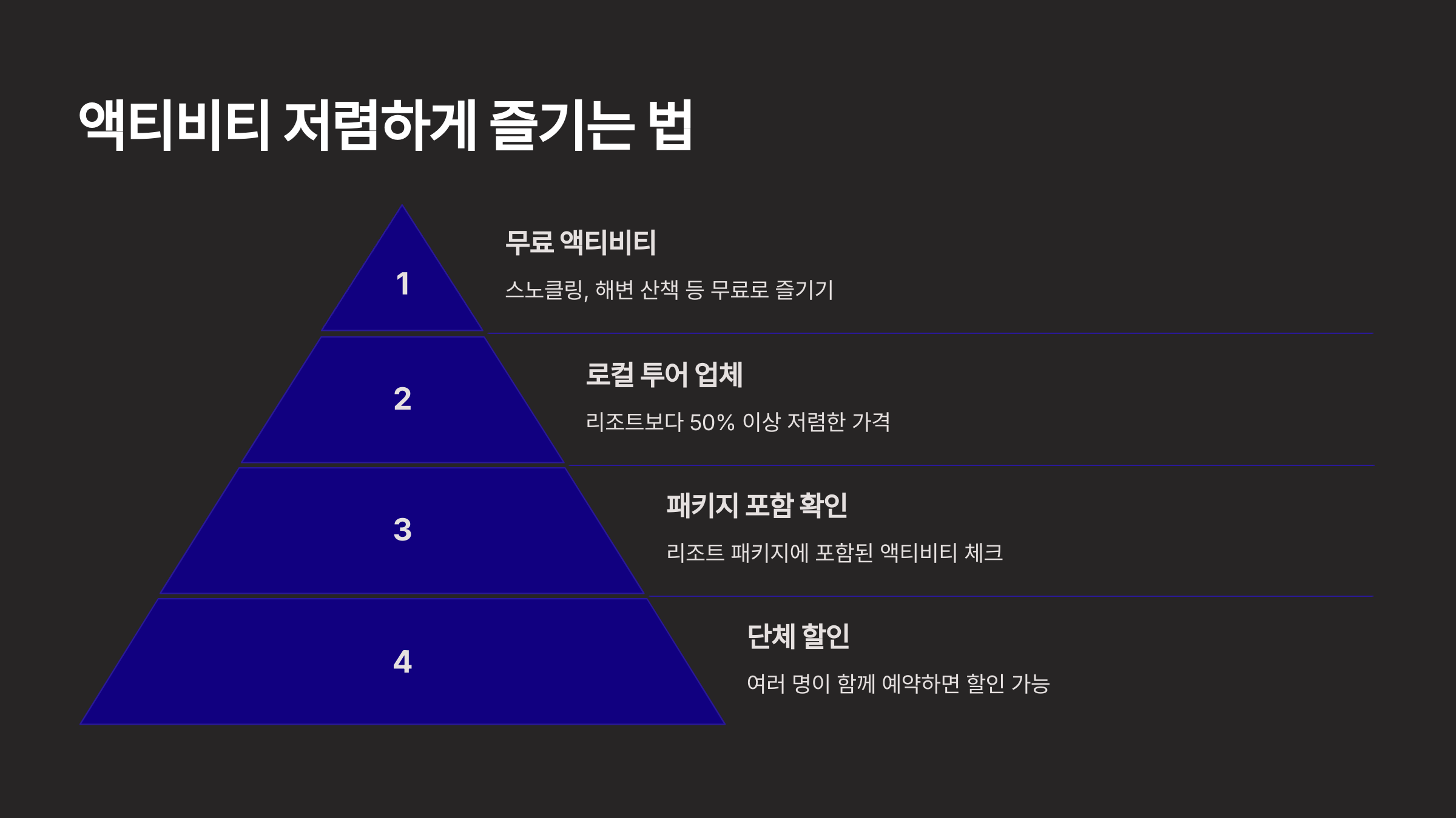 ✅ **공짜 액티비티(스노클링, 해변 산책 등) 적극 활용**