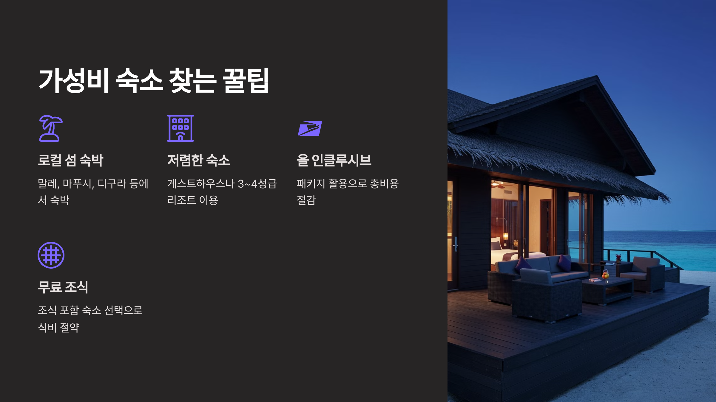 몰디브 리조트는 1박에 100만 원이 넘는 경우도 많지만, 로컬 섬이나 저렴한 리조트를 찾으면 훨씬 저렴하게 숙박할 수 있어요.