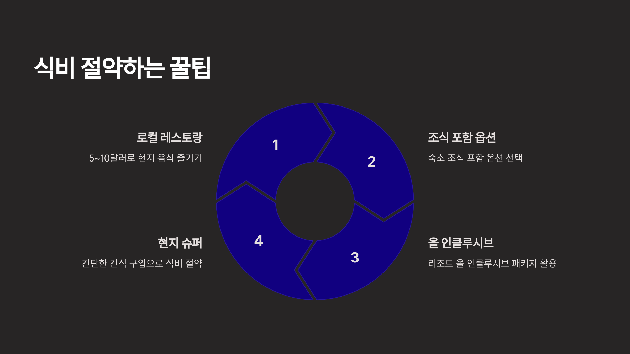 리조트에서 식사를 하면 한 끼에 5만 원 이상 나오기도 하지만, 현지 음식점을 활용하면 훨씬 저렴하게 해결할 수 있어요.