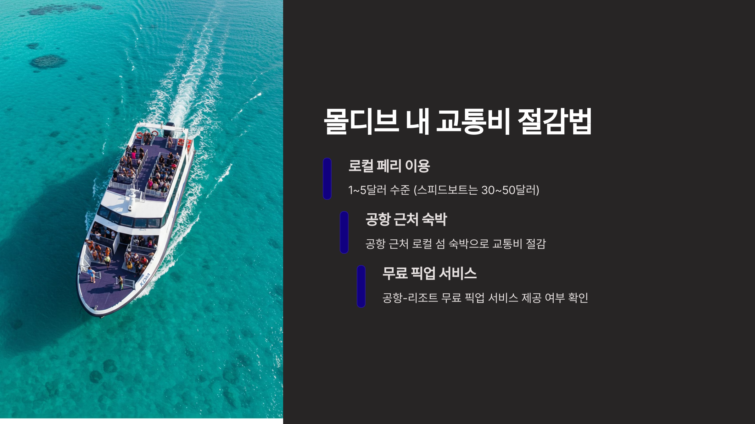 몰디브는 수상비행기나 스피드보트로 이동해야 하는 경우가 많아 교통비도 만만치 않아요. 😥 하지만 아래 방법을 활용하면 비용을 아낄 수 있어요!