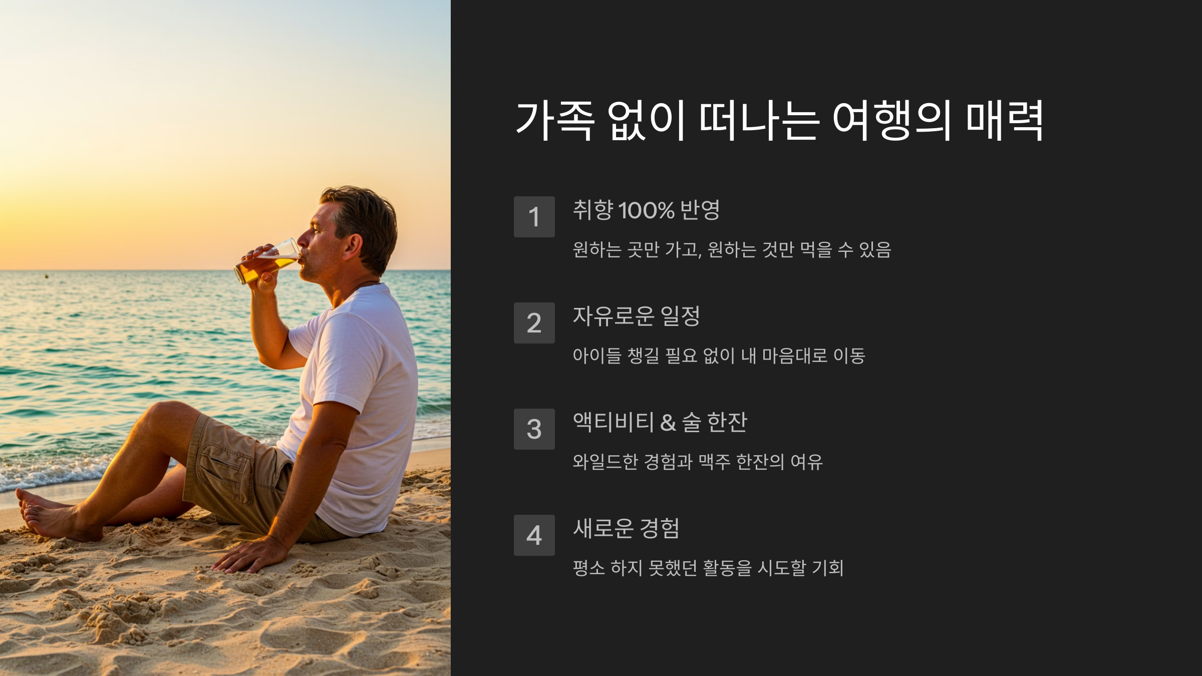 가끔은 아빠도 **온전히 나를 위한 여행**이 필요해요. 이제, 가족 없이 떠나면 더 좋은 곳을 추천해 드릴게요!
