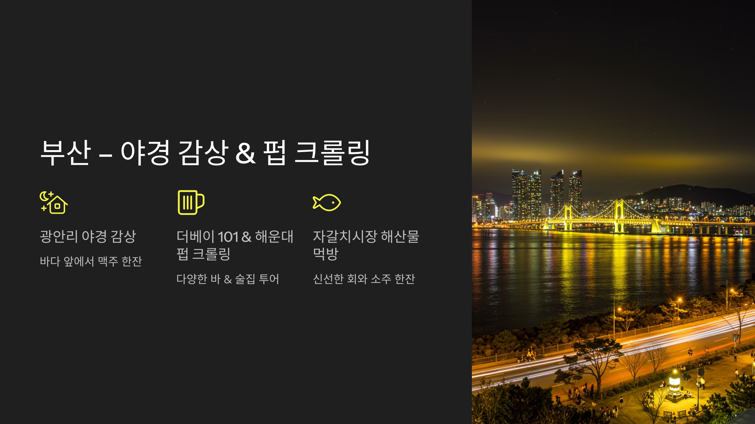 1. 광안리 야경 → 2. 펍 크롤링 → 3. 자갈치시장 해산물
