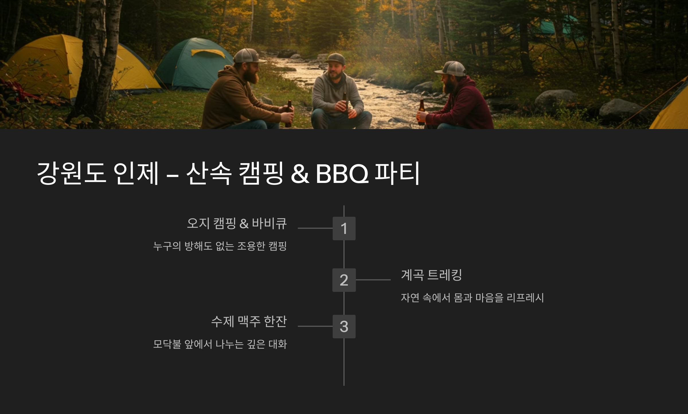 1. 인제 캠핑장 도착 → 2. 계곡 트레킹 → 3. 바비큐 & 맥주 한잔