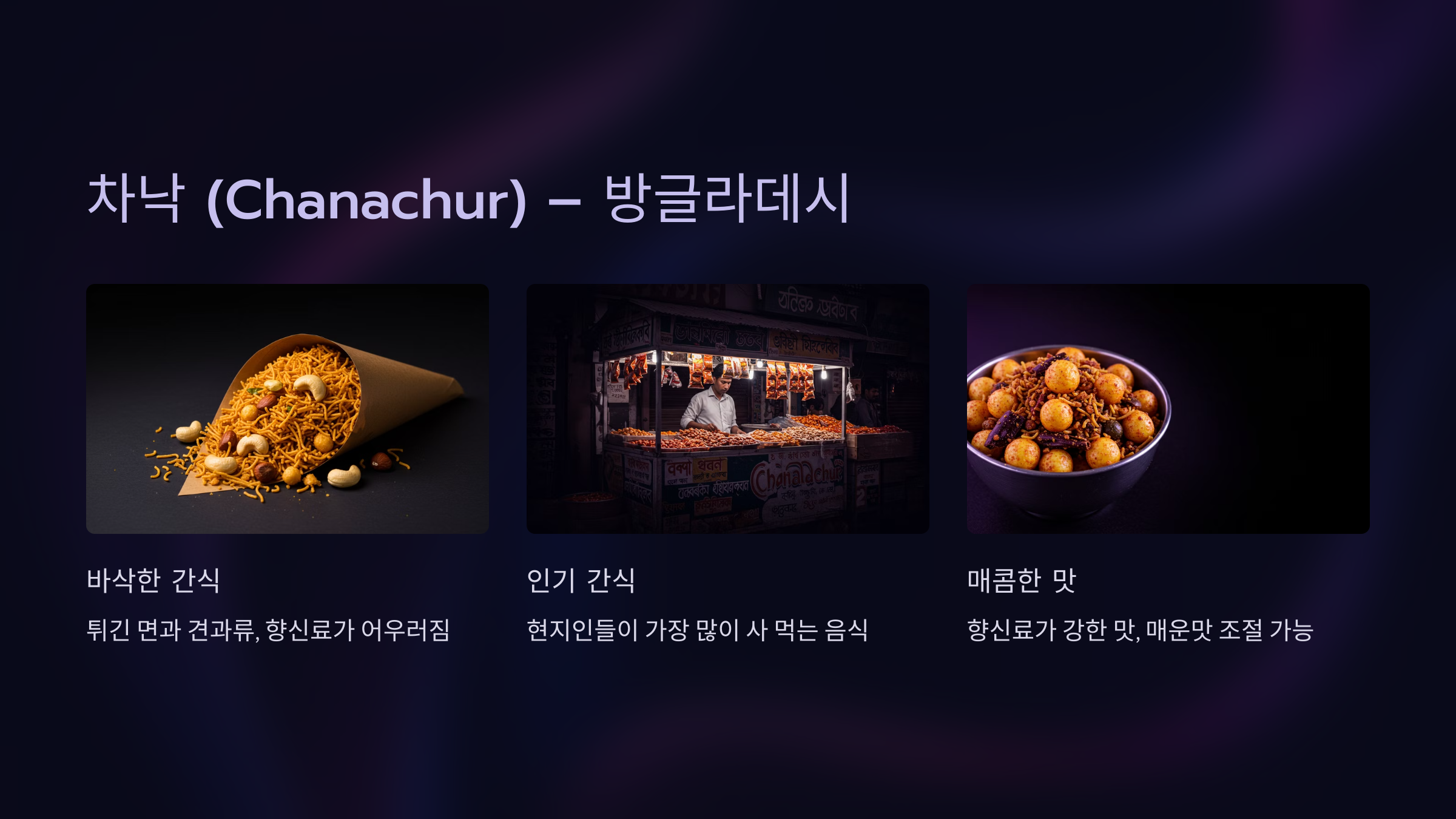 바삭한 튀긴 면과 견과류, 향신료가 어우러진 **매콤하고 짭짤한 간식**이에요. 방글라데시 현지인들이 길거리에서 가장 많이 사 먹는 음식 중 하나!