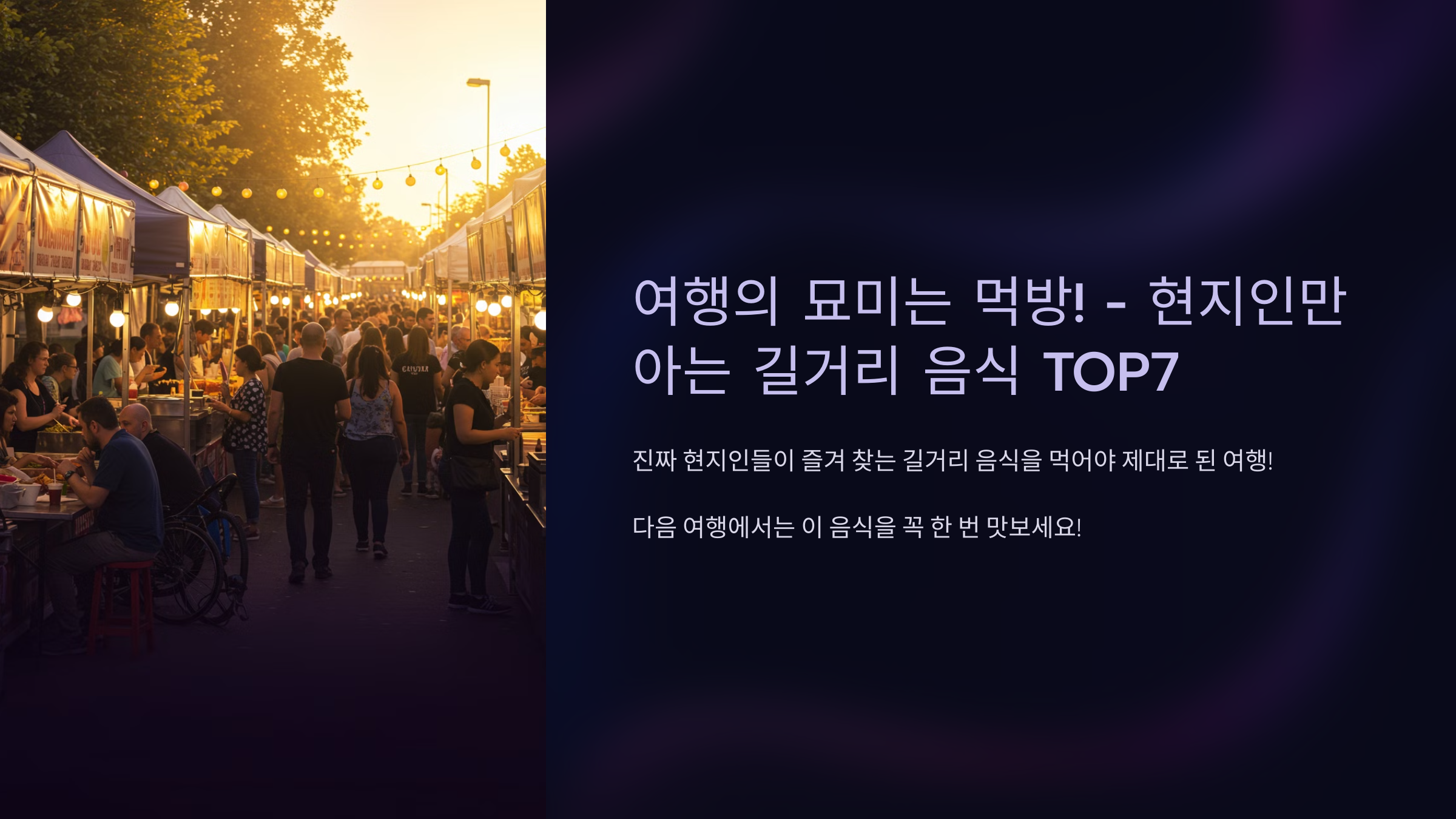 여행을 떠나면 가장 기대되는 것 중 하나가 바로 **현지 음식**이죠! 하지만 관광객을 위한 레스토랑이 아닌, **진짜 현지인들이 즐겨 찾는 길거리 음식**을 먹어야 제대로 된 여행을 했다고 할 수 있어요. 🍽️ 이번에는 **현지인만 아는 길거리 음식 TOP7**을 소개해 드릴게요! 여러분도 다음 여행에서는 이 음식을 꼭 한 번 맛보세요! 😋